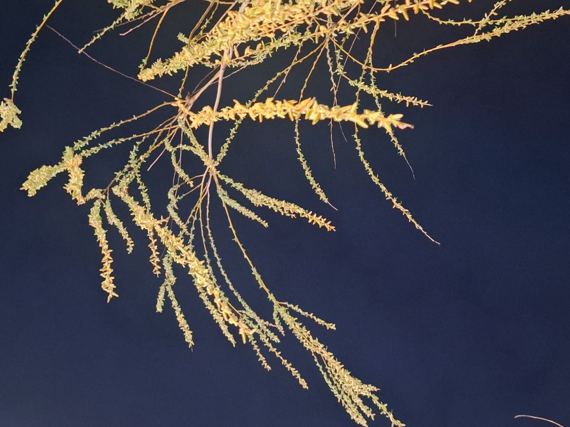 The image captures a section of a plant, likely a tree branch, illuminated against a uniform dark navy blue background, suggestive of a night sky or deeply shadowed wall. Numerous thin, light brown stems and branches spread across the frame. These stems are densely covered with small, clustered, yellowish-green structures, resembling developing leaves, catkins, or immature flowers, which extend outwards and droop downwards. No individuals, animals, or other man-made objects are present. The scene is static. The location is Unknown, Unknown.