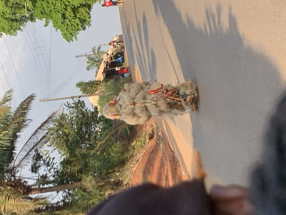 The image depicts an outdoor street scene in Otuocha, Nigeria, under what appears to be late afternoon or early morning light, evidenced by long shadows. **Central Subject:** A human figure, fully enveloped in a masquerade costume, stands on the gray asphalt road. The costume is shaggy, composed of numerous light-colored, fibrous strands, and adorned with red, yellow, and white ribbons or strips primarily on its upper torso and sides. The figure is oriented with its back or right side partially facing the camera. **Foreground:** In the lower-left, the blurry, dark-clad shoulder and the back of a person's head are visible, indicating an observer or the photographer's perspective. **Background (Left):** Dense green vegetation, including large palm trees and various shrubs, borders the road. An unpaved, reddish-brown dirt embankment is visible between the road and the foliage. **Background (Right, Uphill):** The asphalt road continues uphill. On the right side of the road, several utility poles with overhead power lines are visible. Further up the incline, a cluster of simple buildings with corrugated metal roofs are situated. Several individuals are present in this area: one person wearing a red shirt and dark shorts is visible on the far right edge of the frame, walking or standing. Closer to the structures, a small group of figures, including one person carrying a yellow container on their head, and another person next to a motorcycle, are discernible. **Environment:** The sky is light and clear. Distinct shadows from unseen objects and the masquerade figure itself are cast across the road surface.