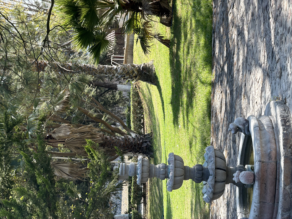 A stone fountain stands near a green lawn, with a hedge running along the edge. Palm trees, some with dried fronds, and other greenery surround the area. A stone wall borders the fountain's space. The scene is bathed in sunlight, creating distinct shadows on the grass and wall.
