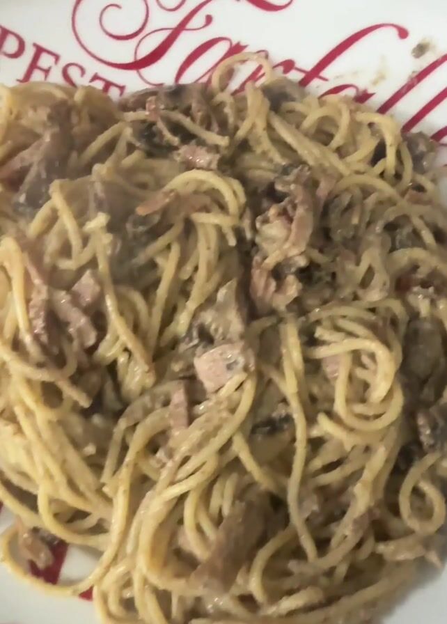 A plate of spaghetti carbonara is shown in a close-up shot. The spaghetti is mixed with a creamy sauce and pieces of bacon or ham, and possibly mushrooms. The plate is white with red lettering that spells out "Carbonara" at the bottom and another word at the top. The video seems to have been taken indoors with the lighting dim. A pink object is partially visible in the background.