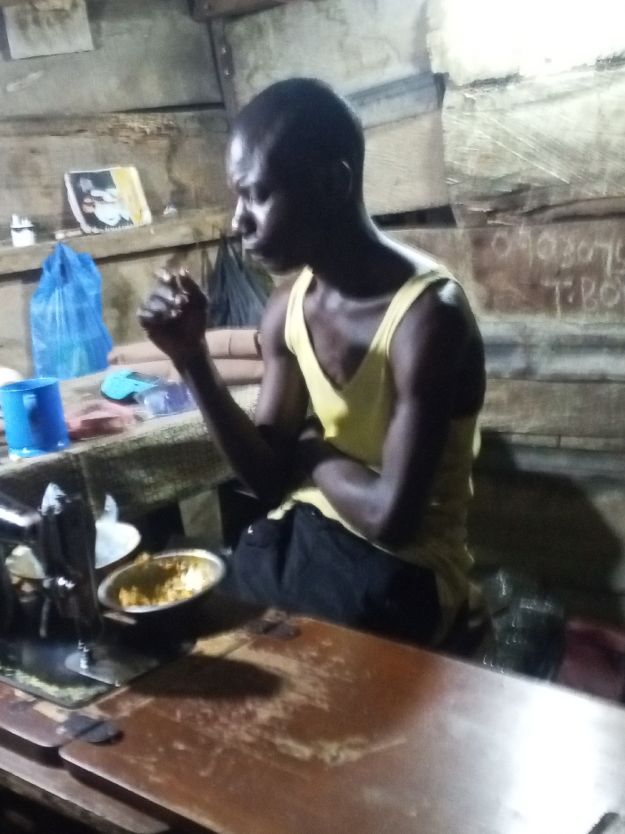 A man in a yellow tank top sits in what appears to be a workspace. He's dark-skinned with a shaved head. He has a bowl in front of him on the table, likely containing food, and a sewing machine is to the left. The background is rustic, possibly a workshop or home. The scene is dimly lit, contributing to an intimate atmosphere.