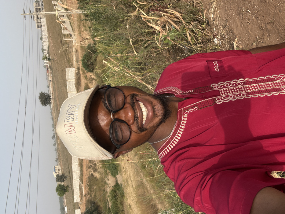 A dark-skinned male subject, approximately 25-35 years old, smiles broadly at the viewer, displaying upper and lower teeth. He wears a light beige trucker-style cap with "TOMMY JEANS NYC" embroidered in red and blue letters, round black-framed spectacles with dark lenses, and a short-sleeved deep red tunic. The tunic features intricate white and cream embroidery outlining the neckline, central placket, and shoulder seams, with subtle vertical striped texture in the fabric. A silver-colored chain necklace is visible around his neck. The scene is outdoors, likely in a developing area of Keffi, Nigeria. The background consists of an undulating landscape covered primarily with dry, yellowish-brown grass and sparse green vegetation, under a bright, hazy sky. Numerous concrete block walls, some appearing as foundations or property boundaries, are visible across the midground. Several partially constructed multi-story buildings, characterized by exposed concrete frames and unfinished walls, are visible on distant elevated terrain. A utility pole with overhead power lines is present on the right side of the frame. Tall, dry grasses and weeds occupy the immediate foreground on the right.