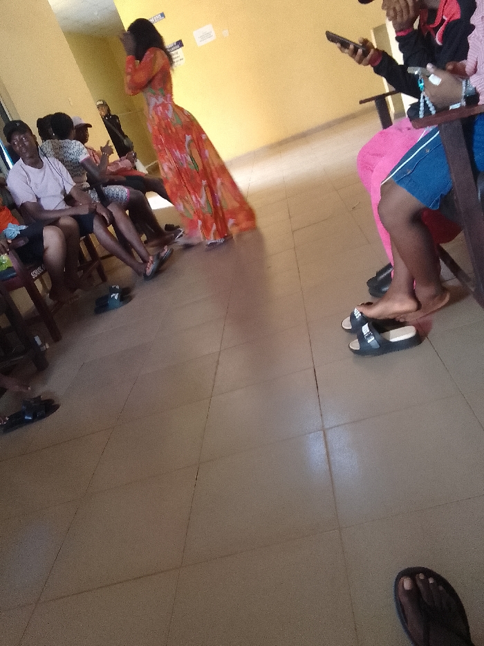 The scene depicts an indoor common area with light brown tiled flooring and plain light yellow walls in Nsugbe, Nigeria. Multiple individuals are present, some seated on wooden chairs, others standing. On the left, a male subject in a light pink t-shirt and dark shorts is seated, looking towards the camera. Another subject, partially visible, is seated next to him, wearing a patterned shirt and dark shorts. Dark slippers are present on the floor near their feet. A wooden stool with "SCHOOL OF" text is visible under the left seating arrangement. In the center, a female subject in a long, flowing orange, red, and green patterned dress stands with her back mostly to the camera, facing towards the right side of the room. On the right, two subjects are seated on wooden chairs. One subject wears a black long-sleeved top over a pink garment and blue denim shorts; they are holding a dark mobile phone and looking down at it. Their bare feet are near black platform sandals with "BOSS" written on the strap. A second partially visible subject in pink is seated adjacent to them, displaying an arm with a white beaded bracelet. White rectangular notices are affixed to the distant yellow wall. A bare foot in a dark flip-flop is visible in the immediate foreground, indicating the photographer's position.
