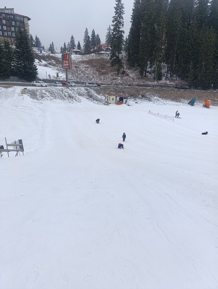 The image depicts a snow-covered winter scene in Pamporovo, Bulgaria, under an overcast sky. In the foreground, a wide expanse of white snow occupies the lower two-thirds of the frame. Several individuals are present on this snowfield, engaged in recreational activities. One person, dressed in dark clothing, is actively sliding downhill on a sled or mat in the mid-left portion of the snowfield. To their right, two individuals, one in dark and another in light blue/grey attire, are walking uphill. Further right, a person in a red jacket is seated on a red sled. Near the right edge, two individuals are visible by a low orange mesh fence, one wearing a green jacket. A dark object, possibly a person or a bag, lies on the snow further right. To the far left, a simple wooden table structure is visible. Towards the far right, two large, partially buried objects, one blue and one orange, appear on the snow. A paved road runs horizontally across the midground, separating the snowfield from an uphill embankment. Several vehicles are present on this road, including two white cars, a red car, and a light-colored van. A large red billboard, displaying Cyrillic text ("Ресторант - Скара" - Restaurant - Grill), stands prominently on a pole above the road. Below the road, a small, light-colored wooden kiosk with a brown roof is situated at the base of a snowy embankment, with a set of steps carved into the snow leading towards it. The background features a multi-story building on the far left, likely a hotel or apartment complex, with numerous windows and balconies. The remainder of the background consists of dense evergreen forests, primarily pine or fir trees, covering the undulating hillsides. These trees are lightly dusted with snow, extending upwards towards the grey, overcast sky.