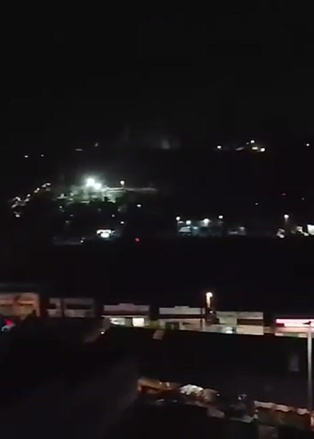 The video depicts a nighttime scene of a city. Lights from buildings and streetlights are visible. Some of the buildings appear to be multi-story. There is a darker, elevated area in the background dotted with lights that may be a hill or mountain. The camera seems to be positioned at a high vantage point, looking down on the urban landscape.