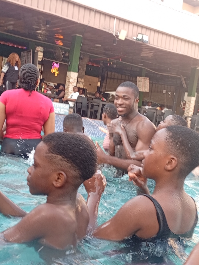 A group of people, including children and adults, are in a swimming pool. A man is smiling at the center. The background features an open-air establishment with seating and signage, possibly a bar or restaurant. One woman with a red shirt is seen from behind and is getting into the pool. Splashes of water are visible, indicating movement and activity.