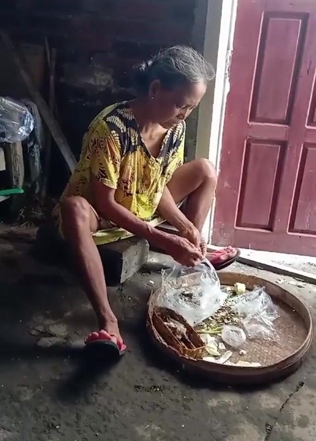 An older woman sits on a small, dark-colored block in an indoor space with a cement floor. She is wearing a yellow patterned top, a light-colored bottom, and red sandals. Her gray hair is pulled back in a bun. She is focused on opening a plastic bag with her hands, which is sitting on a large, round, woven tray containing pieces of food. Behind her is a dark, brick-lined area. To her right is a closed, maroon-colored door. There is also a plastic-wrapped object and wooden planks visible in the background. The floor around her is stained and discolored.