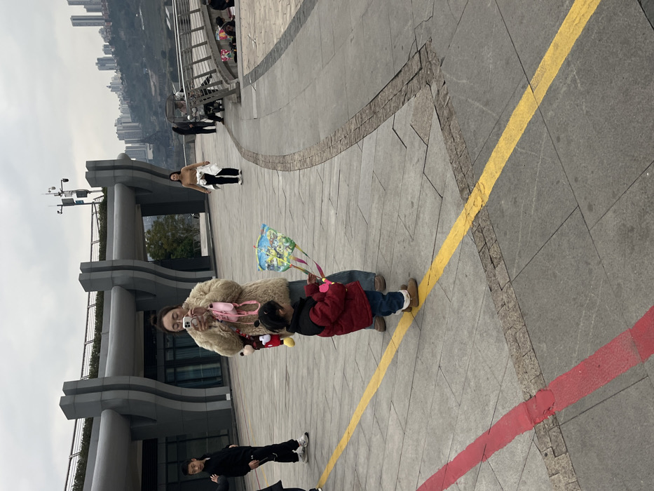 This image depicts an outdoor public plaza or promenade in Banan, China, under an overcast sky. In the central foreground, an adult female with hair tied up wears a light brown faux fur coat, blue jeans, and light brown shoes. She holds a white smartphone horizontally, appearing to capture an image or video. A pink shoulder bag with a red Mickey Mouse plush toy attached is visible on her right side. Immediately in front and slightly to her left, a young child, dressed in a red puffer jacket, blue jeans with rolled cuffs, and light brown boots, holds a colorful cartoon-themed kite with streamers in her right hand. To the left of these figures, a male adolescent in a black long-sleeved shirt, black pants, and white sneakers stands. In the mid-ground, to the right, an adult female wearing a light brown long-sleeved top, a white jacket draped over her shoulders, and black pants walks away from the viewer. Further in the background, near a metal railing, a person is seated on a white scooter-like vehicle, partially obscured. Additional indistinct figures are visible in the far background. The background on the left features a modern grey architectural structure with prominent curved support elements and glass facades. To the right, a distant urban skyline with numerous high-rise buildings is visible on a sloped, natural landscape. The ground is paved with grey square tiles. Two distinct painted lines, one red and one yellow, run horizontally across the foreground. A curved section of darker, possibly cobbled, paving delineates a pathway on the right side of the scene. A utility pole with surveillance equipment is visible in the center-background.