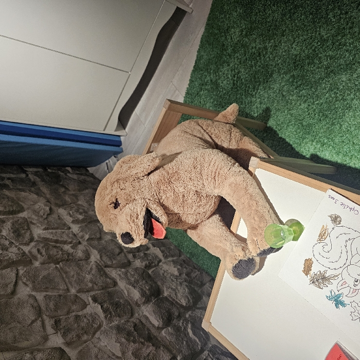 - "A stuffed golden retriever lays on a child's drawing board atop a wooden easel" by FM-63mZD2, licensed under CC BY 4.0