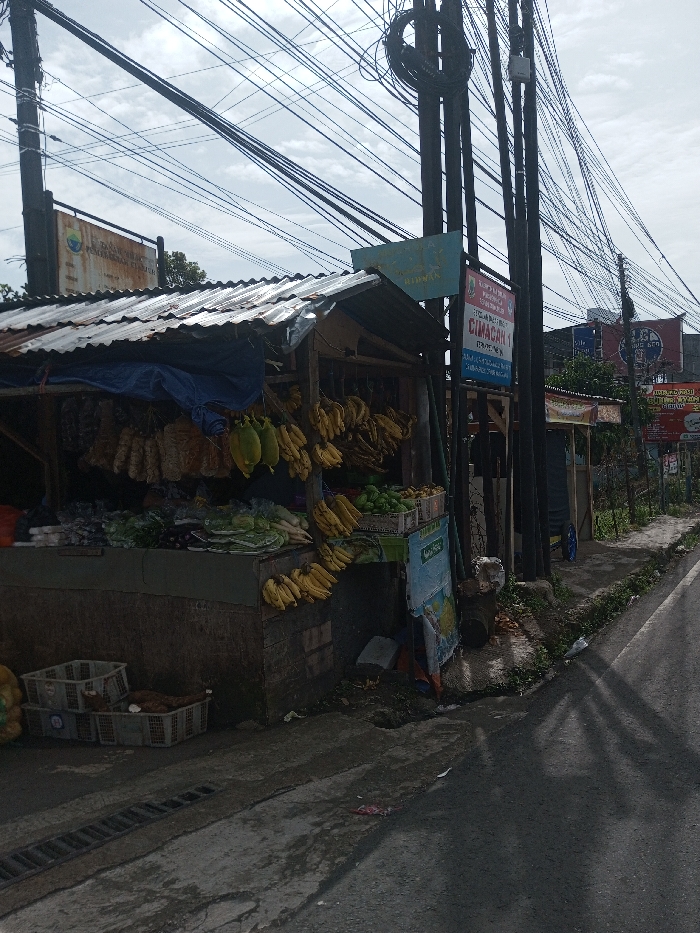 The image depicts a roadside scene in Sandamal Eliya, Sri Lanka, under an overcast sky. A vendor stall with a corrugated metal roof and a blue tarp displays various produce. Hanging items include multiple bunches of yellow bananas, two large green papayas or gourds, and several bundles of light-colored, possibly dried, food items. On a counter, piles of green leafy vegetables, white radishes, and purple eggplants are visible. Further bananas and green fruits are contained in crates. Three white plastic crates are on the ground in front of the stall. A narrow asphalt road with a concrete curb and drain grating runs alongside. Multiple dark utility poles, heavily laden with numerous black electrical and communication wires, line the right side of the road. Visible signage includes a partially obscured light blue sign, a blue sign with red and white text reading "PEMERINTAH KABUPATEN BOGOR" and "KEC. CIMACAN 1," and a red and white banner advertising "AYAM PENYET." No people are visible.