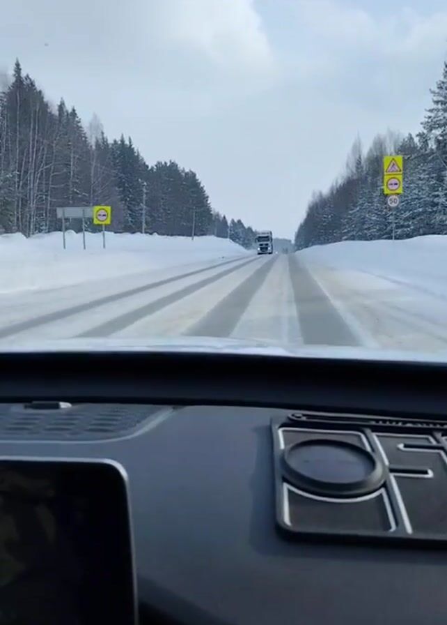 The view from the dashboard of a car driving on a snow-covered road is presented. The road has two lanes divided by cleared tracks, with snowbanks on either side. Tall evergreen trees line the road, creating a forest scene. A white semi-truck is traveling in the opposite direction. Yellow road signs are visible on both sides of the road, indicating speed limits or hazards. The sky is overcast. The camera remains stationary, focusing on the road ahead. The overall mood is cold and wintry.
