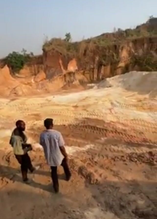 Two men are standing in a sand pit. One man is wearing a patterned shirt and dark pants, while the other man is wearing dark clothes. The sand pit is surrounded by high walls of dirt and sand. A yellow loader truck drives down a slope in the sand pit. The truck is moving towards the camera. Another man sits on the hillside, looking at the truck.