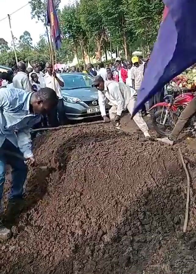 The video depicts a group of people gathered outdoors. Two men are actively digging into a large pile of dirt using shovels. A newer silver car is parked nearby. A motorcycle is also visible on the edge of the scene. Some people are observing the digging, and a flag is being held up in the background. The setting appears to be rural, with trees visible.