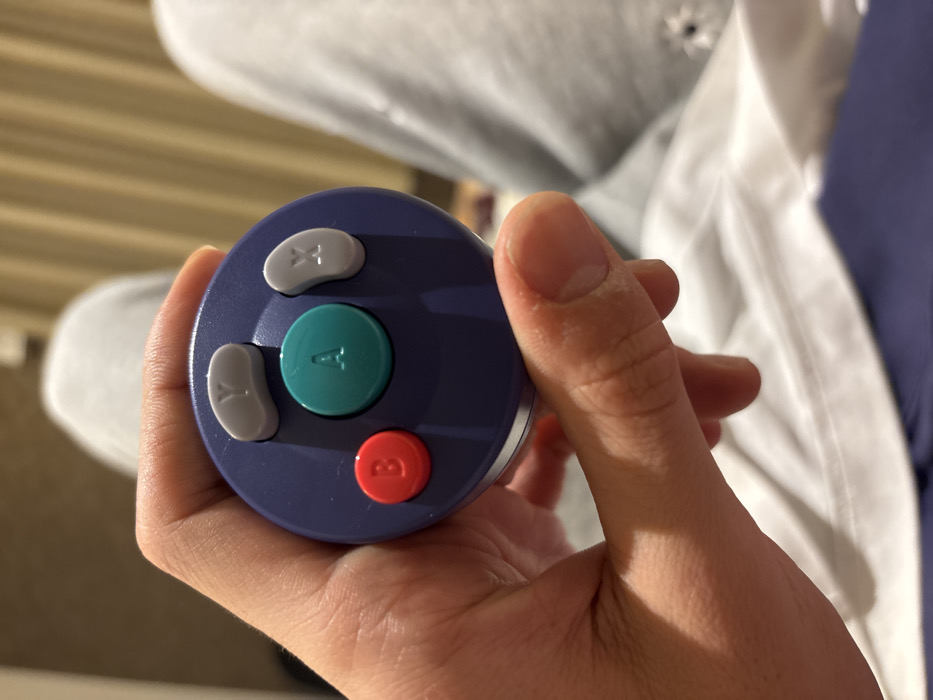- "A close-up image depicts a person's right hand holding a circular, purple GameCube-themed button fidget device in an indoor setting within Kyoto, Japan" by FM-VmvFW2, licensed under CC BY 4.0
