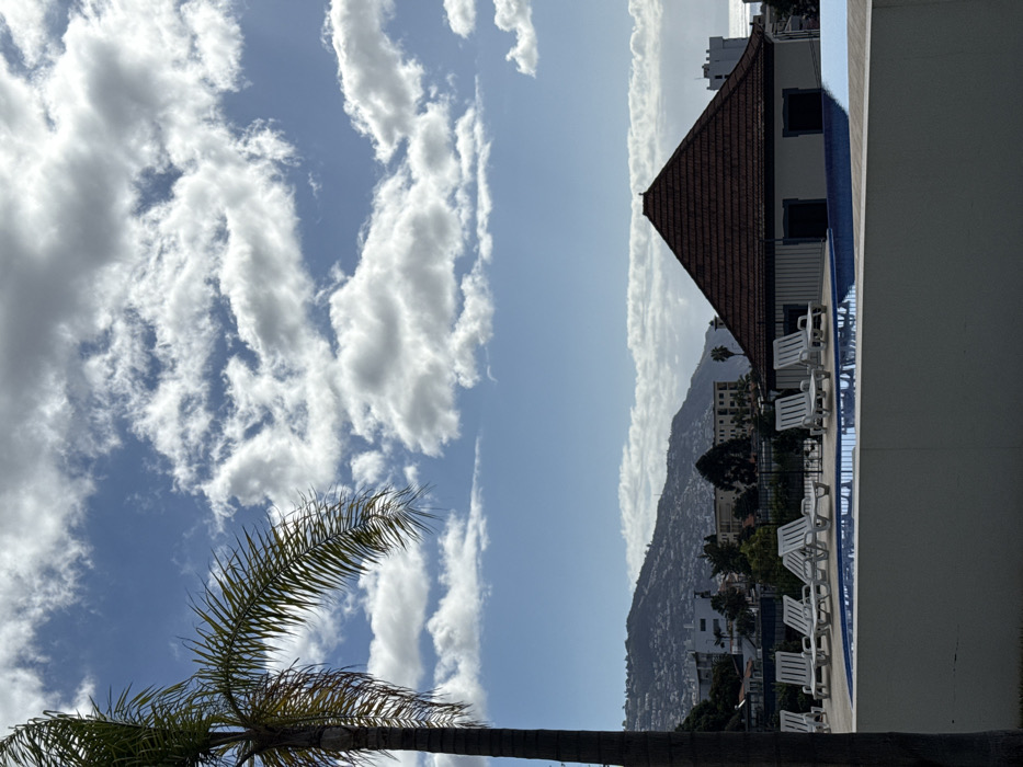 This image displays an outdoor swimming pool area in Funchal, Portugal, under a blue sky with scattered white cumulus clouds. In the immediate foreground, a low, light-colored wall spans the width of the frame. Beyond this wall, a rectangular blue swimming pool is visible. Around the pool's edge, approximately eight white plastic lounge chairs are arranged, all unoccupied. A large palm tree with green fronds occupies the left side of the frame, its dark trunk partially obscured by the foreground wall. In the mid-ground, behind the pool and a dark fence, a prominent building with a distinctive steeply sloped, dark reddish-brown tiled roof and light-colored walls with dark trim is situated on the right. Further in the background, a series of densely populated green hills and mountains rise, covered with numerous white and light-colored buildings, indicative of urban development on the slopes. A sliver of the ocean is visible on the far right horizon, beyond the architectural structures. No individuals are present, and no specific actions or interactions are depicted within the scene.
