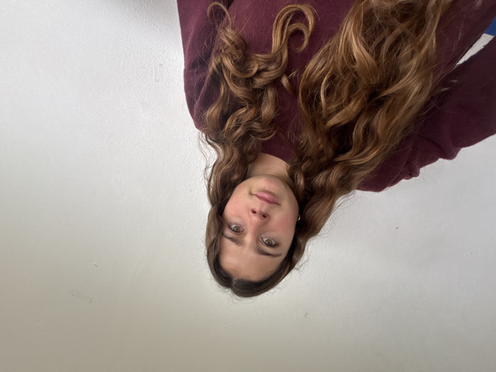This image, captured in Montemor-o-Novo, Portugal, features a single female individual positioned in the lower-left quadrant of the frame. The subject appears to be an adolescent or young adult with long, wavy, light brown hair flowing over her shoulders and chest. She is wearing a plain, maroon-colored long-sleeved sweater. Her head is slightly tilted, and she is looking directly at the camera with a neutral facial expression. The background consists of a uniformly plain, light-colored wall, likely white or off-white, showing minor blemishes. No other individuals, objects, or specific environmental identifiers are present in the visible scene.
