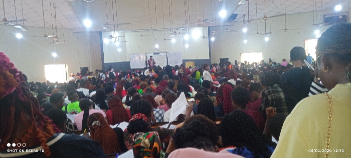 The image depicts a large, densely populated indoor lecture hall or auditorium within the city of Nsukka, Nigeria, likely part of the University of Nigeria, Nsukka. The hall features light-colored walls, a high ceiling with visible ceiling fans, and multiple bright overhead light fixtures. At the front of the hall, a male individual in a patterned shirt stands on a raised platform or stage, actively gesturing while addressing the assembled crowd. Two large whiteboards or projection screens are positioned on the wall behind him. The audience consists of several hundred individuals, predominantly young adults consistent with a student body, seated in rows, uniformly facing the speaker. Many attendees are observed holding papers or notebooks, indicating engagement in a lecture, seminar, or academic event. The overall environment suggests an educational or public speaking setting with a concentrated focus on the speaker. The photograph was captured on February 4, 2020, at 12:35 PM.