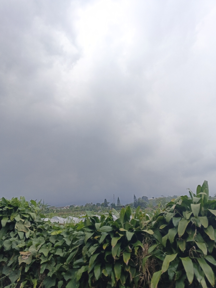 The image captures an outdoor landscape in Siexiengmai, Laos, under a heavily overcast sky. Approximately the top two-thirds of the frame are occupied by dense, grey and white clouds. The horizon reveals distant, dark blue-grey mountains or hills, partially obscured by atmospheric conditions. In the midground, scattered low-rise buildings are visible amidst green vegetation, along with several trees, including conical evergreens. Two tall, slender tower structures stand out against the distant landscape. The foreground features a dense expanse of vibrant green, large-leaved plants, forming a natural barrier. Behind this foliage, areas resembling agricultural fields with white-covered structures, potentially greenhouses or crop covers, are discernible. No individuals or animals are present in the scene.