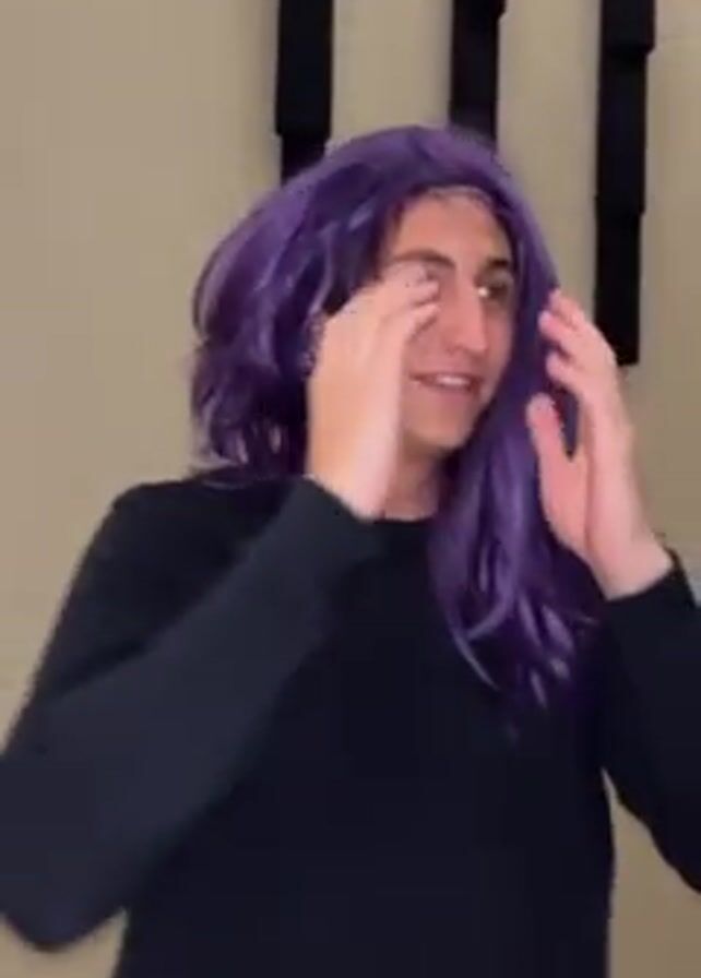 A young man wearing a purple wig is seen in a short video. He is wearing a black long-sleeved shirt. He first spreads his arms, then brings his hands up to the wig, gathering the hair as if to put it in a ponytail, and then shakes it out again. The background is a tan-colored wall with three black vertical rectangular objects hanging on it.