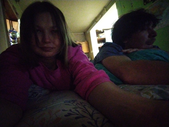 This image depicts two individuals in a dimly lit residential interior located in Perm, Russia. In the left foreground, a female subject with long, dark hair wears a pink long-sleeved shirt. She is positioned on a patterned surface, appearing to lie down, and looks directly at the camera. Her right arm extends towards the lower right of the frame. To her right, a male subject is visible in profile, facing right and away from the camera. He has dark, disheveled hair, wears a dark blue top, and rests his head on a teal-colored pillow or blanket. Both individuals are situated on a surface covered with a patterned sheet featuring dark floral or abstract motifs. The background on the left reveals a lighter wall section and indistinct blurry objects, possibly shelving or furniture, in an adjacent room. The background on the right consists of a solid green-painted wall. The scene is illuminated by low, ambient light.