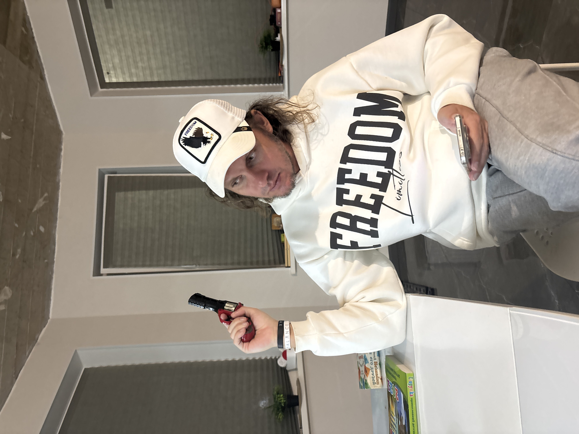 In Ново-Никольское, Russia, a male individual is seated indoors, facing forward and looking to his left. He wears a white trucker cap featuring a black eagle and "FREEDOM" text, an off-white hooded sweatshirt with "FREEDOM Limitless" branding, and grey sweatpants. A white wristband with "BALANCE" text is visible on his left wrist. His raised right hand holds a black object with a red grip, resembling a pistol with a serrated barrel. His left hand, resting on his lap, holds a silver smartphone with a clear case. The room features light-colored walls and an unfinished concrete ceiling. Two windows with closed horizontal blinds are visible in the background. To the subject's left, a white table displays several books with Russian titles, including "Баланс" and "Азбука," alongside a small potted plant. Another small potted plant and a red spherical object are visible on a surface near the right window. The floor is dark patterned tile.