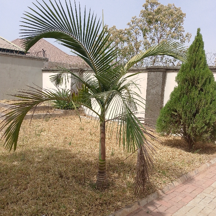 The scene, located in Rayfield, Nigeria, presents an exterior view of a landscaped area under a clear, light blue sky. In the foreground, a paved walkway of reddish-brown interlocking bricks is bordered by a concrete curb on the right. Adjacent to the curb, the ground is covered primarily by dry, light brown grass, interspersed with sparse green growth. A young palm tree with a slender, segmented trunk and prominent green fronds occupies the central midground; some lower fronds exhibit browning. To its immediate right stands a densely foliated, conical evergreen shrub. Behind these plants, a white perimeter wall with gray vertical structural elements extends across the frame, secured at its top with barbed wire fencing. Beyond the wall on the left, a brown shingled roof and corrugated metal fencing on another structure are partially visible, alongside a small terraced garden with green vegetation. In the upper right background, a large deciduous tree with light, possibly flowering or new growth, foliage is visible. No persons, active subjects, or discernible interactions are present.