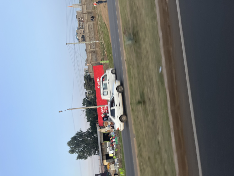 The image depicts a roadside scene in Biashara ward, Kenya, under a clear, light blue sky, possibly during late afternoon or early morning. In the foreground, a dark asphalt road surface is visible, separated by a light brown curb from a grassy median strip containing sparse vegetation. In the middle ground, a two-lane asphalt road runs horizontally. A white four-door sedan is visible on the left lane, moving from right to left, with slight motion blur on its wheels indicating movement. To its right, a white utility van is positioned on the right lane, also appearing to move in the same direction. A tall, grey street lamp post stands to the left of the van. On the far side of the road, behind the sedan, multiple makeshift structures, appearing to be small shops or stalls, are constructed from corrugated metal and various materials. Outside these structures, items such as plastic chairs and buckets are arranged. Behind these structures, a large red billboard with "airtel" branding is prominently displayed. A large green tree is visible behind the structures and billboard on the left. Further right, a dirt shoulder runs alongside the road, leading to a long, light-colored concrete perimeter wall. Beyond this wall, several multi-story buildings, some appearing new or under construction with rooftop water tanks, are visible. Multiple dark power lines traverse the scene above the wall and buildings. Near the center-right of the wall, two individuals are either seated or standing closely together. Further to the right, a lone individual, dressed in a dark top and light trousers, stands facing right, holding a red and white object. Their actions appear to be stationary observation or waiting. No direct interactions between individuals are discernible.