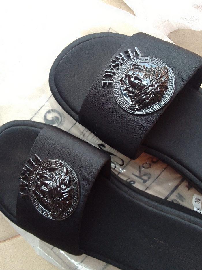A pair of new, black slide sandals are depicted. Each sandal features a wide, black fabric strap. Centrally affixed to each strap is a circular, dark metallic emblem. The emblem prominently displays the Versace Medusa head logo, encircled by a Greek key pattern, with the word "VERSACE" embossed above the head. The soles of both sandals are black, with the brand name "VERSACE" subtly embossed on the footbed of the lower sandal. The sandals rest on a clear, crinkled plastic packaging material. Beneath the packaging, a light-colored surface, possibly paper or cardboard, is visible, bearing faint black text and markings, including the numbers "39" and the word "BLACK." The scene is set on an indeterminate flat surface, likely indoors. No specific city or external location is discernible.