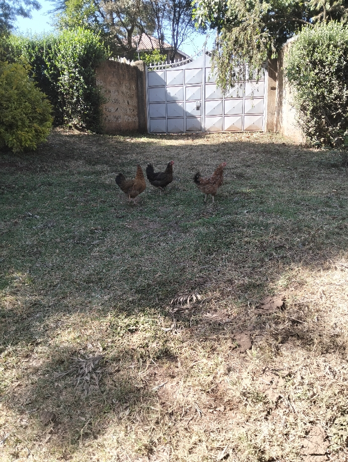 The image depicts an outdoor residential or rural scene within Ngong ward, Kenya, under clear daylight conditions. Three domestic chickens are positioned on a lawn with interspersed green grass, dry patches, and bare earth. The leftmost chicken is light brown, facing right; the middle chicken is dark brown to black, facing left; and the rightmost chicken is reddish-brown, also facing left. All three chickens appear to be standing or foraging on the ground. In the background, a closed, light-grey metal gate with a square-paneled design is centered. The gate is flanked by concrete block walls, topped with visible security fencing, and dense green hedges or bushes. Beyond the walls and hedges, mature trees with varying foliage are visible against a clear blue sky. A reddish-brown tiled roof of a structure is faintly discernible through the trees on the left side of the background. Sunlight casts distinct shadows across the foreground and on the gate.