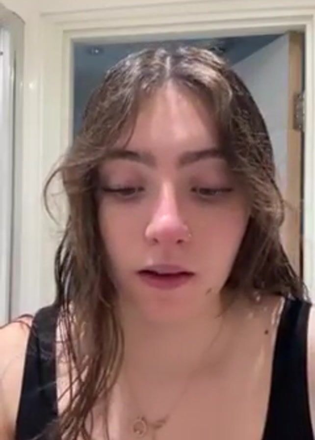 The video features a woman with brown hair and light eyes, wearing a black tank top, in front of a bathroom. Her hair is wet and loose. She has a nose piercing and is wearing a necklace. The woman is putting on mascara. The bathroom behind her has white tiles and a door frame with a door ajar.