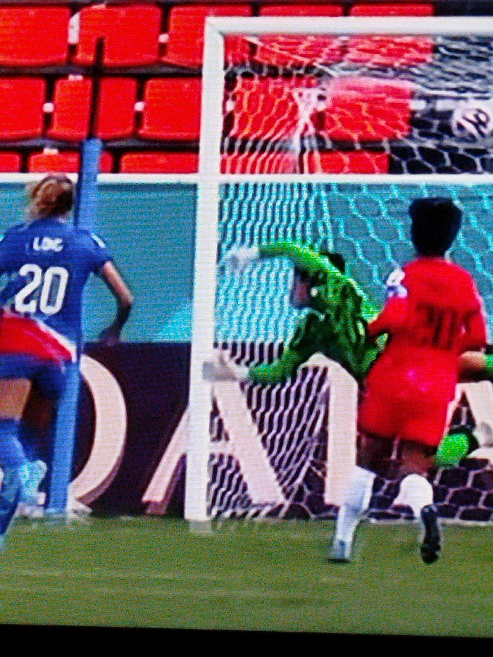 The image displays a soccer match in progress within a stadium located in Meknes, Morocco. Three female players are visible on a green grass field near a white goal with dual-colored netting: blue in the lower section and red/black in the upper part. A goalkeeper, dressed in a bright green long-sleeved jersey and green bottoms, is captured in a mid-air dive or stretch to her left, suggesting an attempt to block a shot or make a save. To the right of the goal, a player in a red jersey with the number "20" printed on her back is in motion, running towards the right side of the frame. On the far left, partially obscured by a blue vertical pole, another player wearing a blue jersey marked with "LDC" and the number "20" is standing. Behind the goal, rows of red stadium seats are visible. An advertisement board featuring the partial white letters "DA" on a dark background is positioned at ground level behind the goal frame.