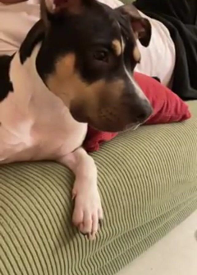 On a green striped sofa, a tan, black, and white dog lies resting its head on a red pillow. A person wearing a white shirt is seated next to the dog. The person has a hand near their mouth. The dog has a calm expression. The floor is tiled.