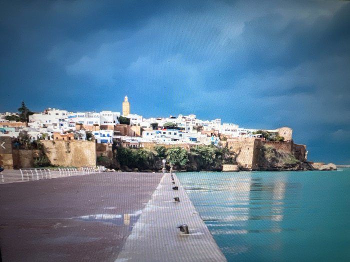 The image displays a panoramic view of the city of Salé, Morocco, under a dynamic sky