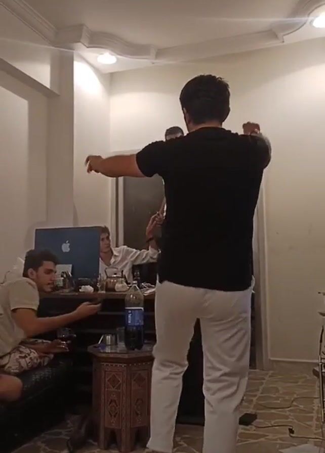 man dancing in what looks like a living room. He is wearing a black t-shirt and white pants. There are three other people in the room, two of whom are sitting on a couch, one using a phone. In the background, there is a desk with a computer. A decorative side table is next to the couch, with a soda bottle and a cup on it. The room is well lit, with decorative molding around the ceiling.