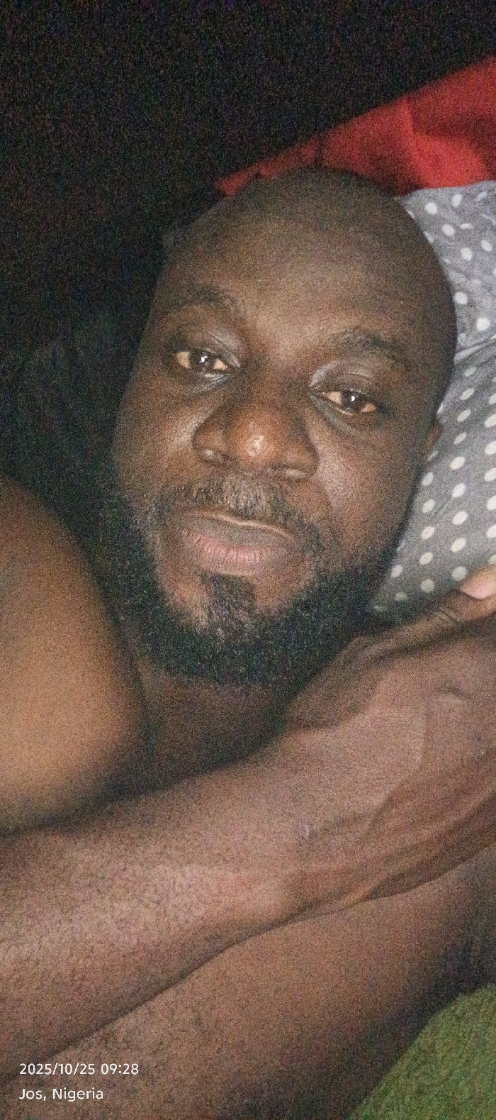 On 2025/10/25 at 09:28 in Jos, Nigeria, an adult male with dark skin and a bald head is depicted in a close-up, dimly lit, head-and-shoulders portrait. He possesses a dark beard and mustache, with visible stubble on his cheeks and chin. His eyes are open, looking directly towards the camera, and his mouth is closed, set in a neutral expression. He appears to be lying down, with his bare chest and shoulder visible on the left side of the frame. To his right, a grey pillow with white polka dots is visible, supporting his head. A strip of red fabric, possibly a blanket or sheet, is partially visible above the pillow on the top right. The background is largely dark and indistinct, indicating an indoor setting with limited illumination.