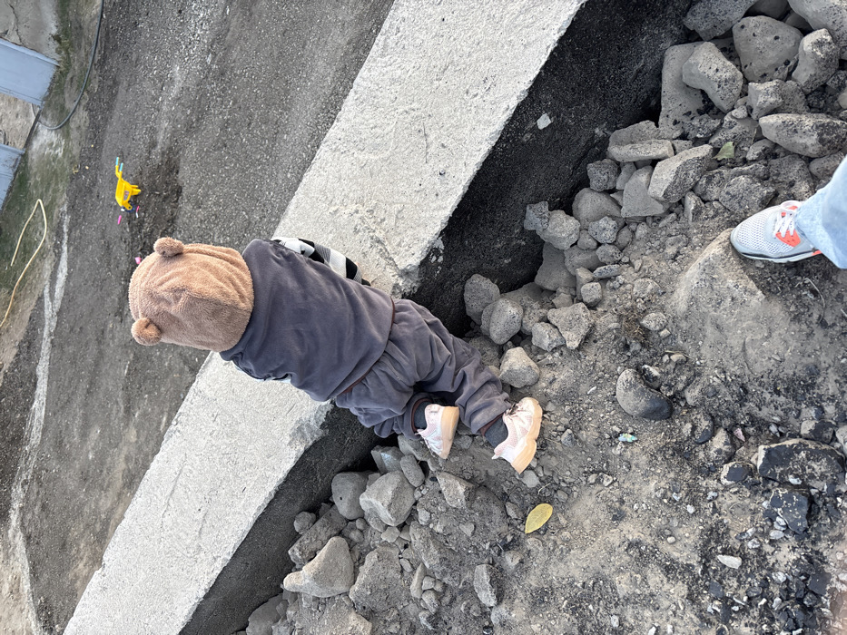 The image captures an outdoor scene in Vaghatin, Armenia. A child, viewed from behind, sits on a light gray concrete slab that spans horizontally across the middle ground. The child wears a brown, fleece-like hood with bear ears, a dark gray long-sleeved top with black and white striped sleeves, and dark gray trousers. Light-colored sneakers with dark socks are visible on the child's feet, which rest above a mound of various-sized gray and dark gray rocks, rubble, and dirt. A single yellow leaf and minor debris are present on the ground near the child's feet. The concrete slab's lower edge is painted black. Beyond the slab, in the background, is a rough, dark ground surface. A yellow plastic toy, possibly a vehicle, and segments of a yellow and a dark hose are visible on this surface, with a light-colored building structure partially visible further in the background. In the lower right foreground, a portion of an adult's left foot, wearing a white, gray, and orange sneaker, is visible on the dirt and rubble.