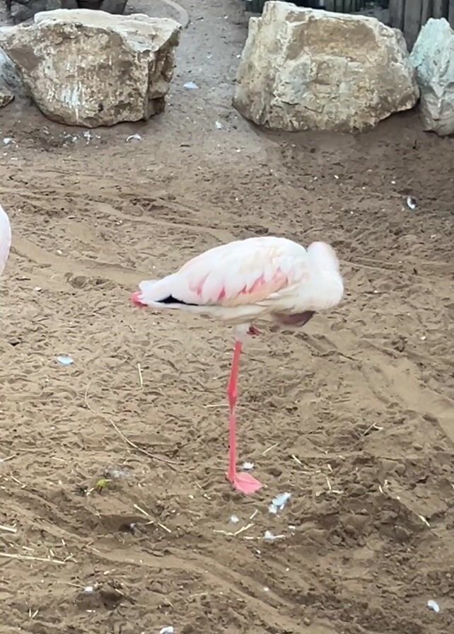 flamingo standing on one leg in a sandy enclosure at a zoo