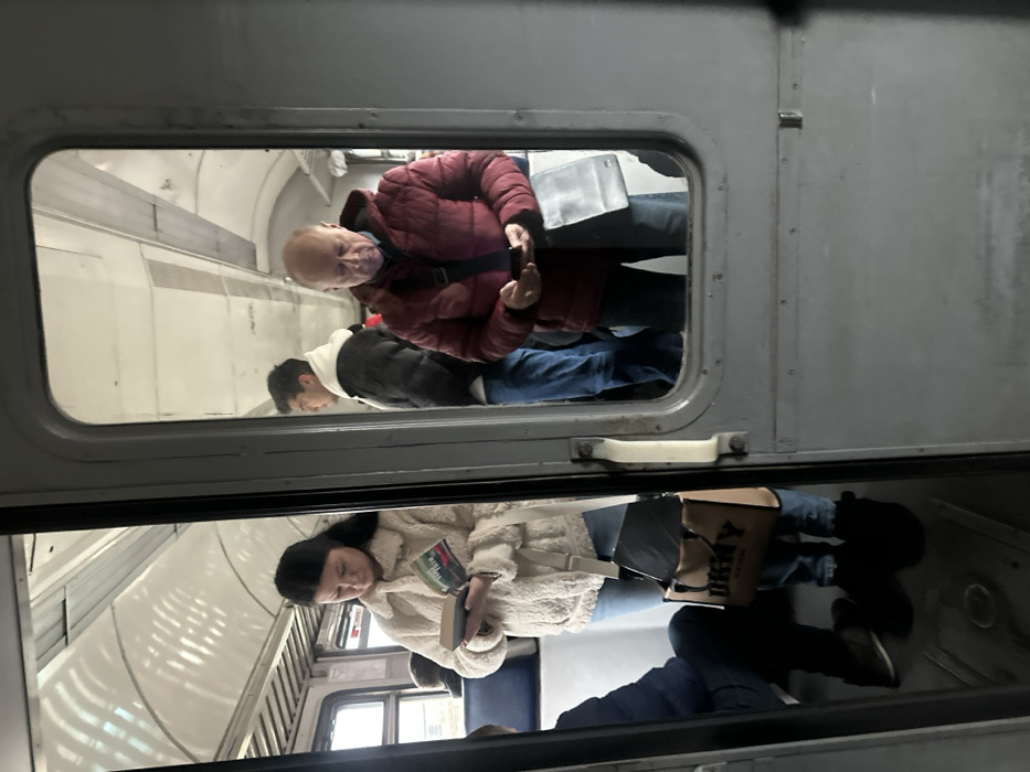 Through the window of what seems to be a train, a man in a red jacket is seen standing. Behind him stands another person in a dark jacket with a white hood. Below the window, there is a woman in a white fleece jacket holding books. One of the books has the title "Sommerside." She appears to be standing in another section of the train. Part of another person's jacket is visible below her.