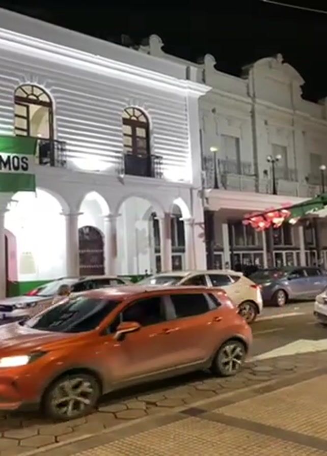 nighttime street scene with several cars parked and driving by. Pedestrians are present. A large white building stands in the background, decorated with a green banner that reads "SIEMPRE LIBRES CRUCENOS SEAMOS". The architecture is colonial or neoclassical, with arched windows and decorative features. There's a mix of classic and modern cars. Music can be heard in the background.