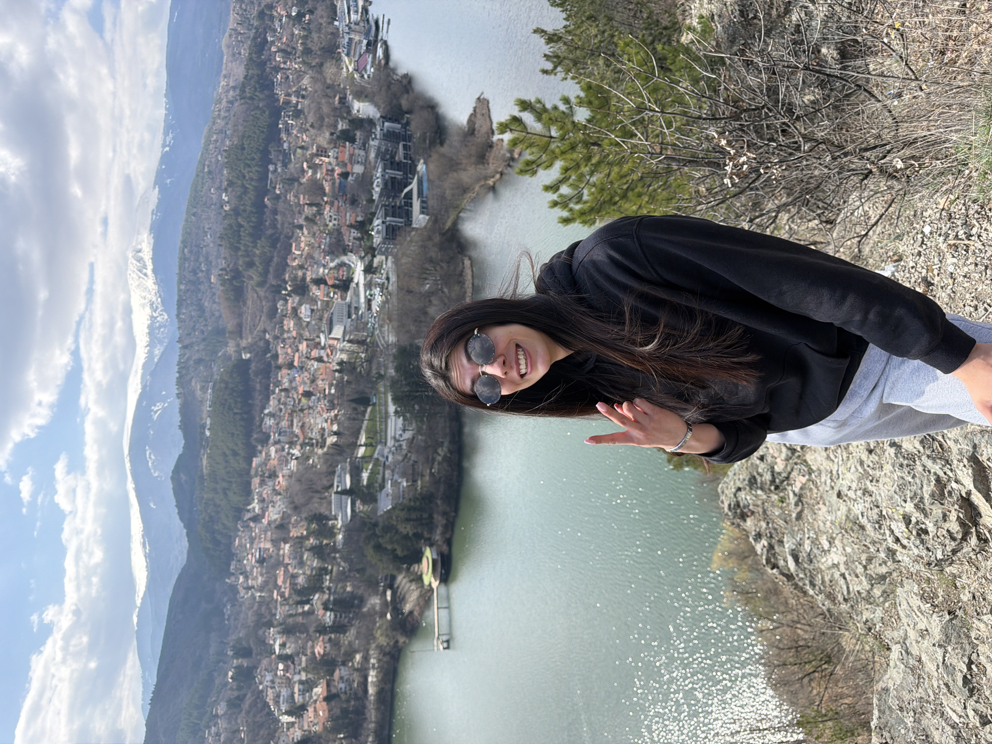 A single female individual stands on a rocky, elevated overlook, posing for a photograph with Pancharevo Lake and the town of Pancharevo, Bulgaria, visible in the background. She is smiling broadly, wearing dark, round sunglasses, a black hooded sweatshirt, and light grey sweatpants. Her left hand is raised, displaying a "peace" sign with light pink painted fingernails. The foreground consists of sparse dry vegetation and bare trees amidst rocky terrain. Pancharevo Lake is visible below, reflecting sunlight, with a circular building on a pier extending into the water. Beyond the lake, numerous residential and commercial buildings of Pancharevo are situated along the shoreline and ascending hillsides, which are partially forested. In the far background, snow-capped mountains rise under a partly cloudy sky.