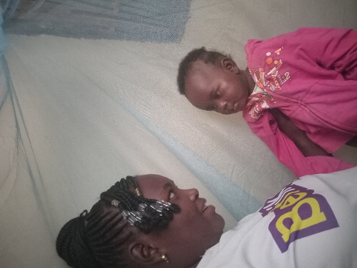 A woman and baby lie under a mosquito net. The woman looks at the baby, who is swaddled in a pink hooded jacket. The woman is wearing a white T-shirt with a large, stylized purple and yellow design on the front. Her hair is braided, with beads woven into some of the braids. The light is soft, and the overall scene suggests a quiet, intimate moment.