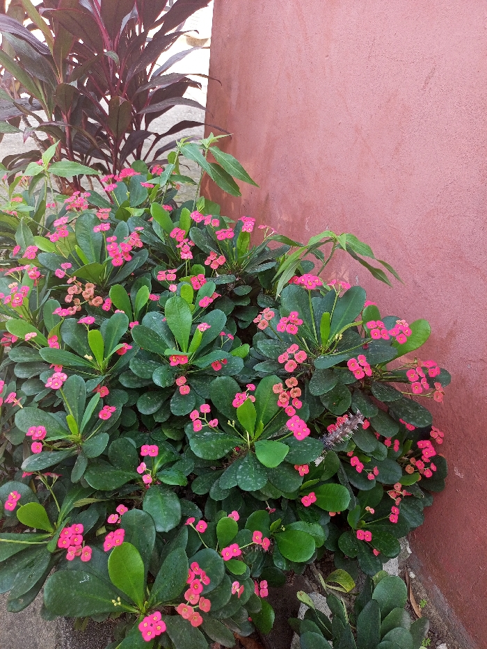 The image displays an outdoor scene in Ado, Nigeria, featuring a dense *Euphorbia milii* (Crown of Thorns) bush. The bush is replete with numerous small, bright pink to reddish-pink bracts and prominent dark green, ovate leaves. It is positioned adjacent to a reddish-pink, textured stucco wall that occupies the right side of the frame. To the left and behind the *Euphorbia milii*, a taller plant with dark reddish-purple, elongated leaves is partially visible. Resting on a leafy branch of the *Euphorbia milii* in the lower-center right is a segmented caterpillar, light-colored with dark markings and distinct spines. The ground beneath the plants is a grey, possibly concrete, surface with scattered leaf litter. No human subjects, actions, or interactions are present.