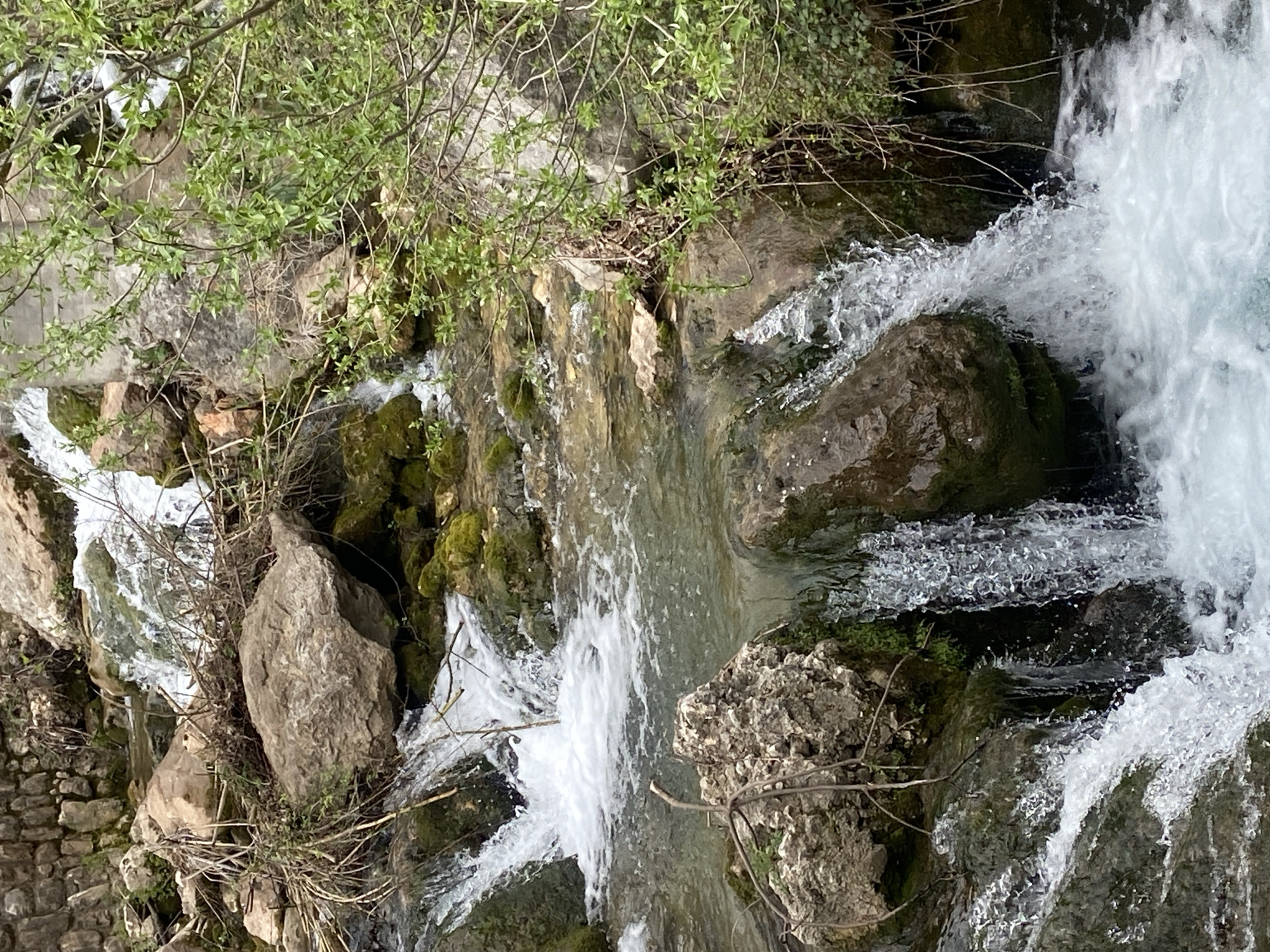 The image depicts a cascading stream flowing over rocks and stones. Green vegetation and moss grow on the rocks, adding to the natural ambiance. The location of the stream is Krapina, Montenegro. There are no people or obvious subjects in the frame, the water is the main subject. The primary interaction is the water flowing with force over the rocks.