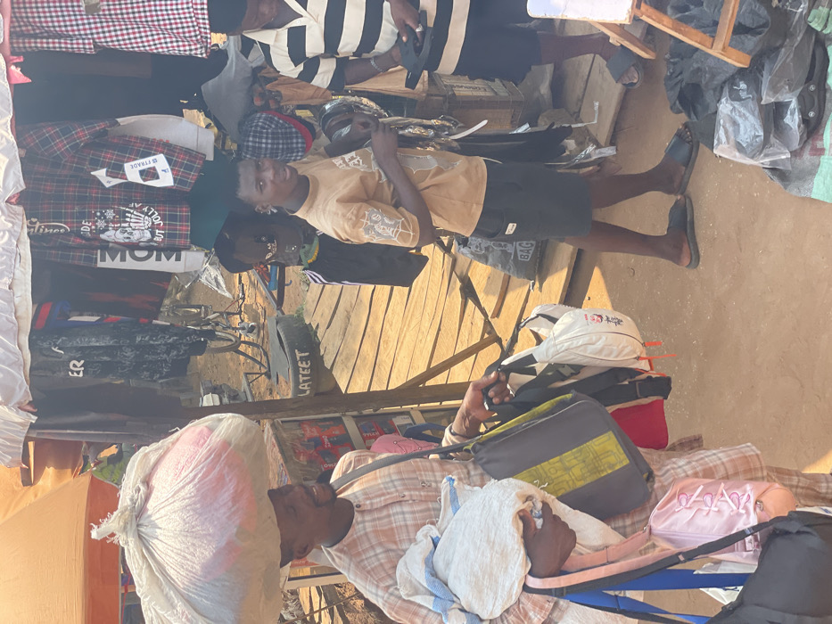 This image captures a bustling outdoor market scene in Ikoga, Nigeria. In the foreground, an adult male with dark skin, wearing a light plaid long-sleeved shirt, smiles while balancing a large, white, translucent bag filled with pink items on his head. He carries multiple other bags, including a white sack, a grey/green shoulder bag, a pink shoulder bag, and a black bag, indicating he is a vendor or transporter of goods. To his right, a young adult male in a light brown graphic t-shirt and dark shorts stands barefoot on black slides, holding and examining black items, possibly shoes or accessories. Further right, partially visible, another adult male in a striped polo shirt and dark shorts also holds black items, suggesting he is a vendor. The environment features a dirt ground, a raised wooden platform acting as a stall, and an orange tarp providing shade. Various clothing items, including plaid and graphic shirts, hang for display. A black tire with "LATEET" painted in white sits on the wooden platform, and a bicycle is visible in the background. A cooler with beverages is present behind the man on the left.