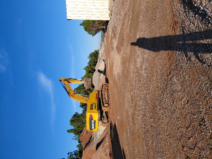 A yellow Shantui excavator lifts dirt in a construction zone under a clear blue sky with scattered clouds. The ground is covered in gravel and dirt. A pile of dirt is to the excavator's side. A building's side is in the background. A long human shadow is cast across the gravel. Trees line the background and dot the horizon.