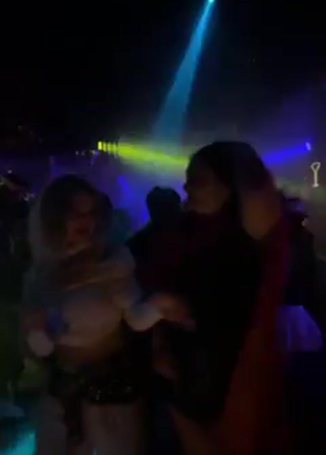 two women dancing in a crowded nightclub. The woman on the left has long blonde hair and is wearing a cream-colored top, light pants, and a black belt. The woman on the right has long brown hair and is wearing a black top and a red cape. Both women are facing the camera and moving their arms and bodies to the music. There are other people in the background, some of whom are also dancing. The club is dark, but it is lit by colorful spotlights, including green, blue, and purple. There is also a disco ball hanging from the ceiling.