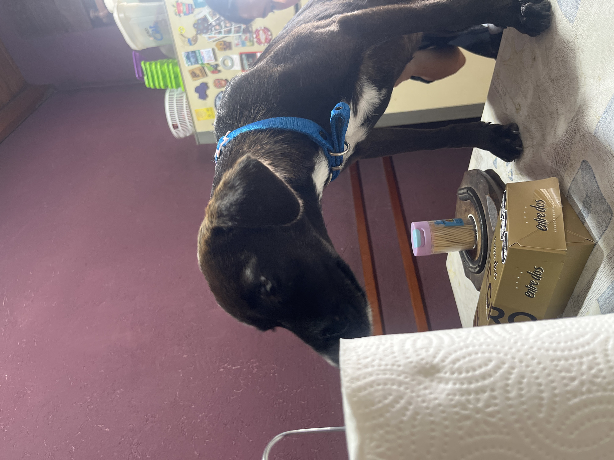 - "A dark-coated dog with a blue collar is standing on a table next to a roll of paper towels, a box of toothpicks, and a box of "entre dos" Alfajores" by FM-vIRwr1, licensed under CC BY 4.0