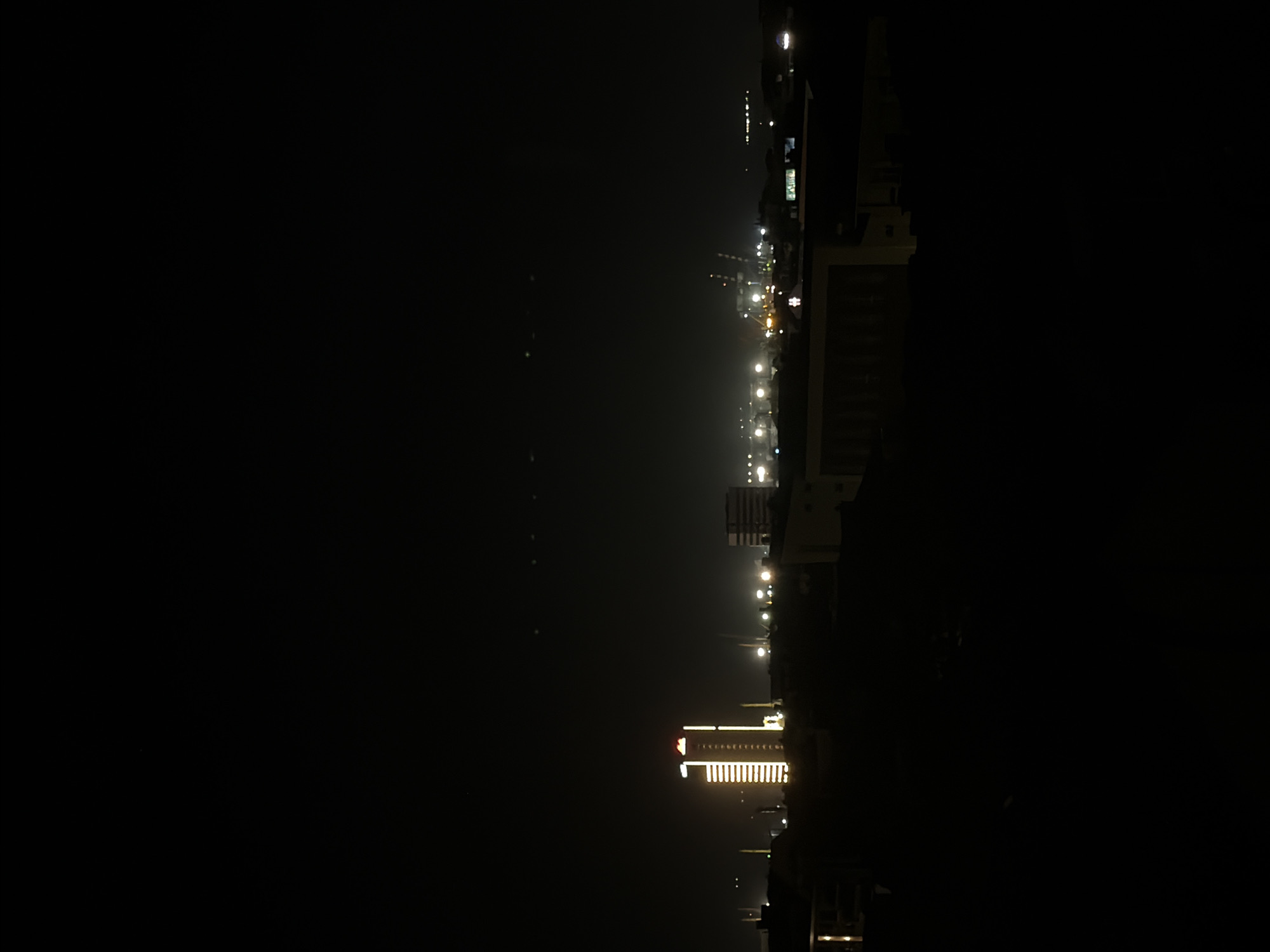 At night, the image shows a cityscape with lights, possibly Burgas, Bulgaria. In the foreground, a tall building is illuminated, with a pattern of lights going vertically. Further back, streetlights are visible, and the silhouette of buildings can be seen against the dark sky. The left part of the image is mostly black, suggesting it's dark and unlit. The image is rotated 90 degrees clockwise. There are no people visible in the picture.