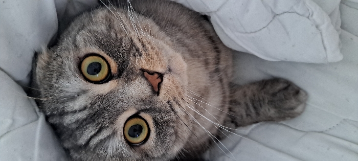 - "A Scottish Fold domestic cat with grey and silver mackerel tabby fur is depicted in a close-up, upward-facing portrait, situated in an indoor environment in Murino, Russia" by FM-FrnGi2, licensed under CC BY 4.0