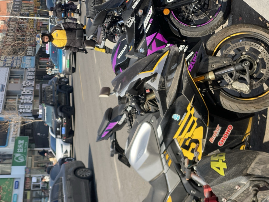 The image displays an urban street scene in Taihe District, China, under clear, sunny daytime conditions. In the foreground, three sport motorcycles are parked side-by-side, angled towards the left. The leftmost motorcycle features a silver fuel tank, black fairings with yellow "5" and "46" graphics, and "Brakar" and "CHOHO" stickers. Its front wheel has a yellow rim stripe. The middle motorcycle exhibits dark fairings with yellow and grey accents and "SUZUKI" branding. The rightmost motorcycle is black with prominent bright pink/purple geometric graphics, "SUZUKI," "GSX-R," and "299" text, and a pink/purple front rim stripe. In the midground, a male individual stands facing right, positioned between the motorcycles and the street. He wears a black and yellow padded jacket, black gloves, a black fanny pack, and a black and yellow full-face helmet. The street behind him carries vehicular traffic, including a dark gray sedan, a white sedan, a black off-road style SUV equipped with a roof rack and light bar (displaying a blue license plate), and a light blue/silver taxi. The background consists of a row of multi-story commercial buildings lining the street. Visible signage in Chinese characters includes a green sign for "益永堂" (Yi Yong Tang) and a larger sign for "超越时空电竞馆" (Beyond Time and Space Esports Arena). Leafless trees are interspersed along the street, indicating a colder season.